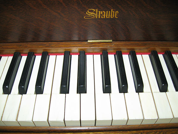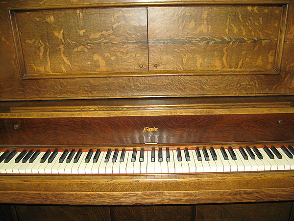 This beautiful tiger oak upright was once a player piano. It has a deeper case with bigger resonance, but all the player parts are gone leaving only the moving front and bottom panels. The player just had too many issues to revive.