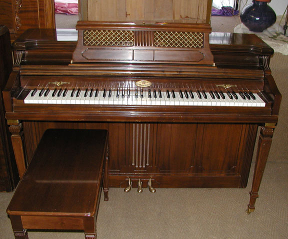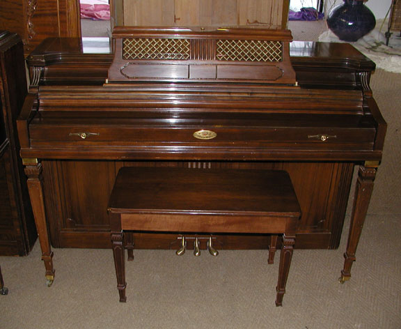 • Comments: This little piano should serve a beginning student well. It has light yet responsive action. Unique music rack design w/brass tubing mesh. Includes bench.