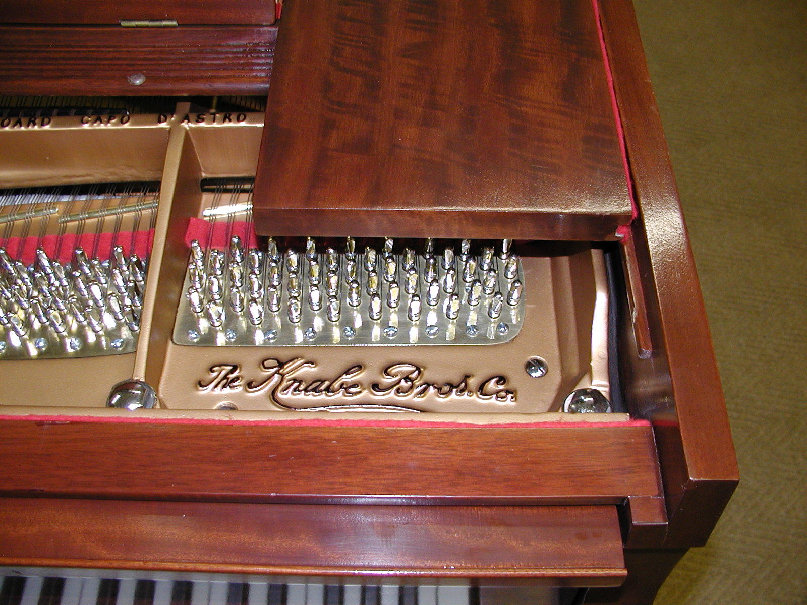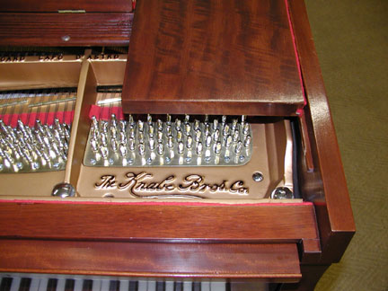 • Decorative brass plates cover the top of the pinblock on this piano, with the pins protruding through. Unique plate design is 'webbed" and open between rim bolts.