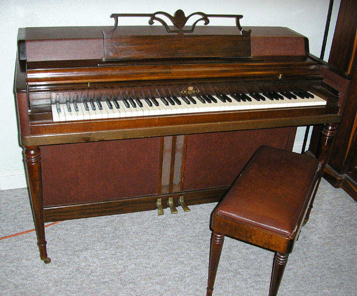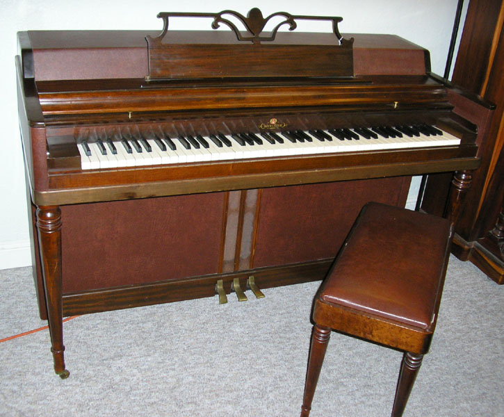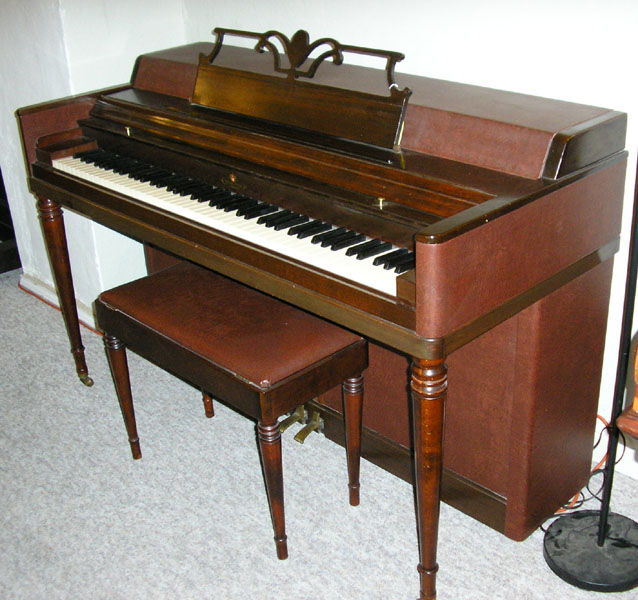 • Comments: A blast from the past with it's leatherette and mahogany retro looks! Holds a tuning and has a springy/responsive action. Includes bench.